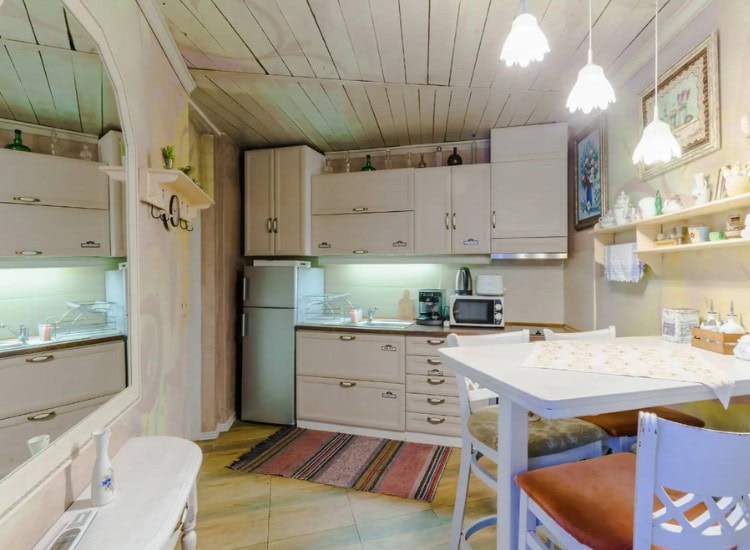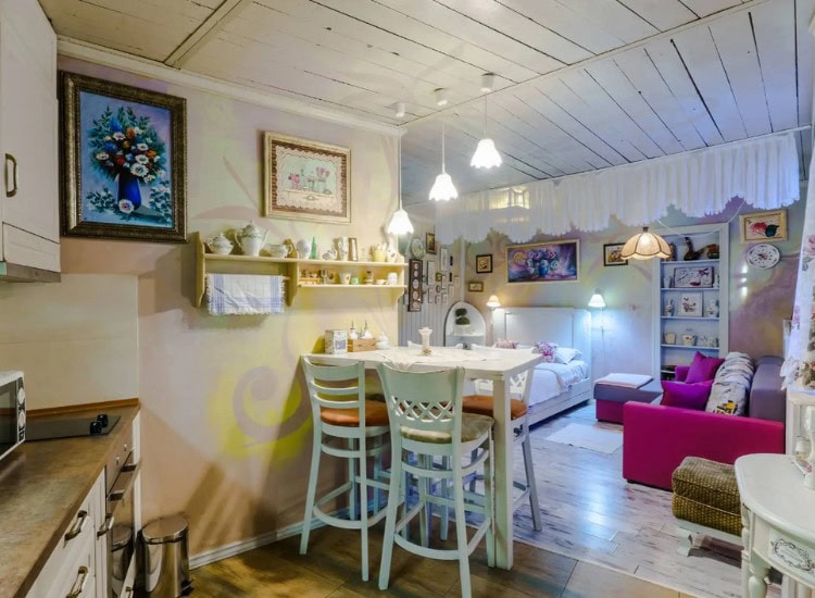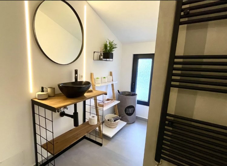 The house has a studio with 1 double bed and a sofa bed, and a 2-bedroom suite with 1 double and 2 single beds. Each of the rooms and the studio have a private bathroom. Up to 3 people can be accommodated in a studio and up to 4 people in a suite. Accommodation for up to 8 people is in a studio and a suite.